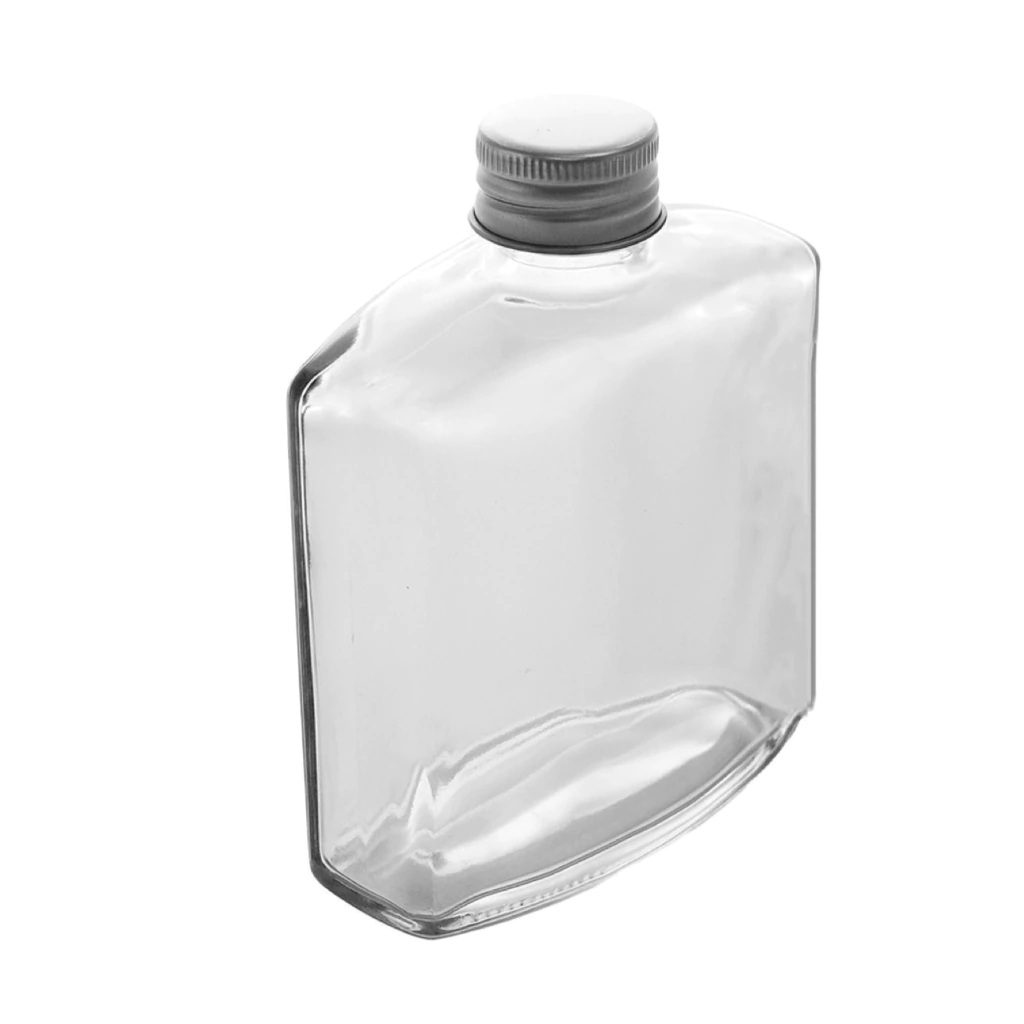 Garrafa de Bolso de Vidro 100ml com Tampa de Alumínio Prata – a combinação perfeita de praticidade e elegância para você levar suas bebidas favoritas para qualquer lugar!